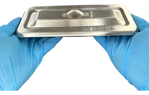 Charola quirúrgica tipo budinera con tapa, fabricada en acero inoxidable de alta calidad. Diseñada para uso médico, dental y hospitalario, ideal para almacenar, transportar y esterilizar instrumental.