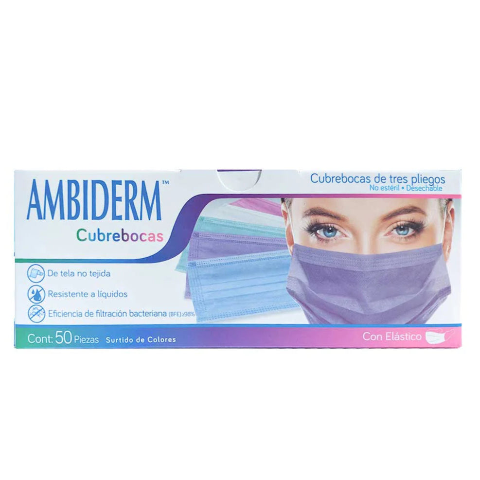 Cubrebocas tricapa ambiderm® para adulto de varios colores elaborado con tres pliegos, cuenta con filtro antibacterial, diseñado con un elástico y tiene un ajuste nasal, la superficie es suave, resistente a los líquidos, la tela no es tejida por tres pliegos, es desechable y no es estéril.