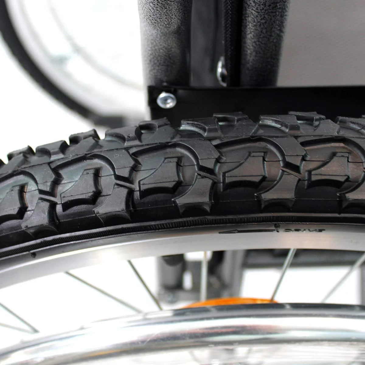 Esta silla de ruedas con llantas neumáticas es ideal para terrenos irregulares, elaborada en acero resistente y ligero con terminado de pintura esmaltado.